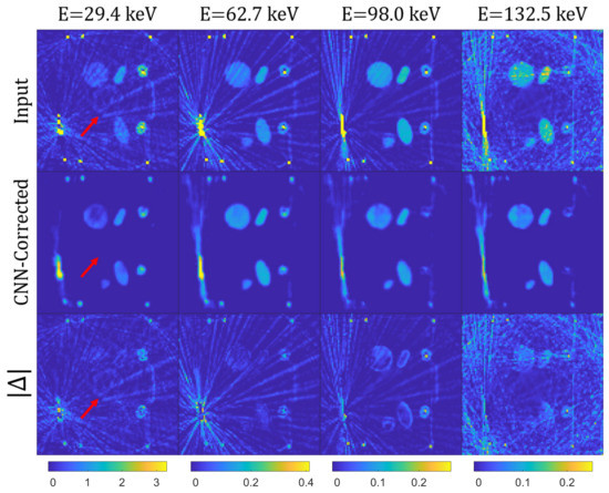 Slice of the suitcase for the input (first row) and CNN-corrected (second row) data at different energies and the absolute difference between the two (third row). Note that each column, corresponding to a fixed energy channel, has identical color map. The red arrow indicates a hollow object look-like artifact, which does not appear in the higher energy channel and is efficiently removed by the correction.