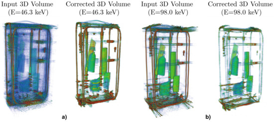 Input and MAR corrected 3D volume reconstruction of the suitcase at in (a) and at in (b). The CNN correction clearly reduces most of the artifacts increasing dramatically the quality of the reconstruction.