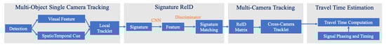 Our key contributions can be summarized broadly as follows: (1) we propose a novel video-based signature ReID method with high precision that plays a key role for multi-camera vehicle tracking; (2) we introduce a novel way to extend pairwise signature matching to phase-based signature matching to tackle the sequential-group-signature ReID problem on traffic video datasets; and (3) we propose a real-time video processing system for multi-camera vehicle tracking and travel-time estimation; We evaluated the proposed framework on a real-world dataset from intersections in Florida with pan and fisheye cameras. Although our results were presented for three intersections, the pairwise intersection nature of our approach allows for scaling this approach to larger numbers of intersections. Overall, our experiments demonstrated the viability, effectiveness, and scalability of the proposed approach. Our future work will extend this to computing origin–destination travel times to all pairs of inputs and outputs across all intersections in a corridor or a traffic network.