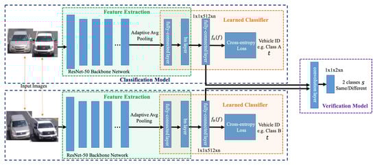 The popular deep learning ReID methods are leveraging high-level semantic information and designing novel objective functions to encourage models to learn a discriminative feature representation. The two main types of loss functions are classification loss and verification loss. Classification loss directly uses the label information of the signature to do multi-class classification. Verification loss determines whether the two input signatures belong to the same object. Hybrid approaches have shown improved performance by combining both in model learning [57]. Therefore, we chose to use both the classification loss and the verification loss.