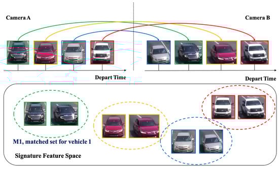 An illustration of matched-vehicle sets and their distributions in the feature space. The colored solid arrows indicate the one-to-one mapping results.