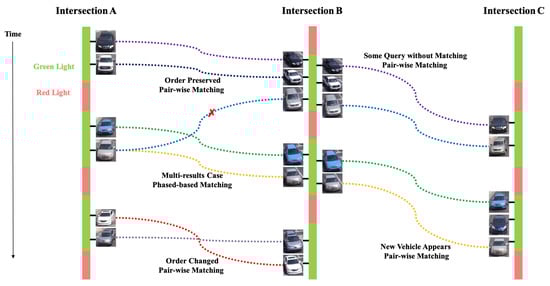 An illustration of across-camera matching. Our primary matching strategy is pair-wised matching using our discriminator. For cases with multiple matching results, phase information is used as an additional constraint to refine matching. We defined five types of matching cases: (1) order preserved (pairwise matching)—order of signature sequence does not change among intersections; (2) multi-results (phased-based matching); (3) order changed (pairwise matching); (4) some query without matching (pair-wise matching); and (5) new vehicle appears (pairwise matching).