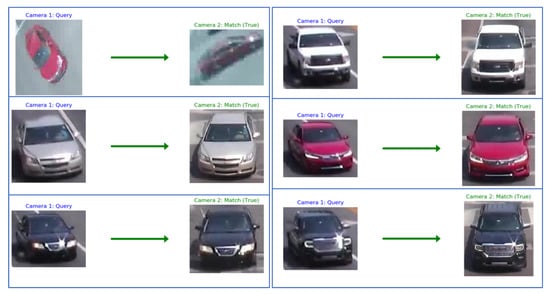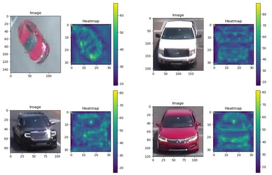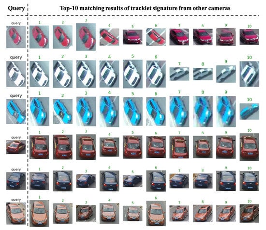 We present qualitative results of signature matching. First, we present visualization of several activation maps of features from our signature-matching network. As shown in Figure 6, the signature ReID network shows different activation patterns for the vehicles. In Figure 7, we present sample results of cross-camera tracking with estimated travel time. In this example, all vehicles that are going straight (left two lanes) in intersection 1 have correct signature-matching from intersection 2. During this phase for the group of vehicles (11 vehicles), the average travel time is about 57.3 s. We present examples of pairwise signature-matching results in Figure 8, which demonstrates good matching for both fisheye camera and pan camera data. In Figure 9, we show examples of the top 10 matching results for queries from our dataset and the VeRi dataset. To compute the top 10 matching results, our gallery dataset includes both pan and fisheye cameras. The experimental results show that our discriminator network has reasonably high accuracy to retrieve correct matching.