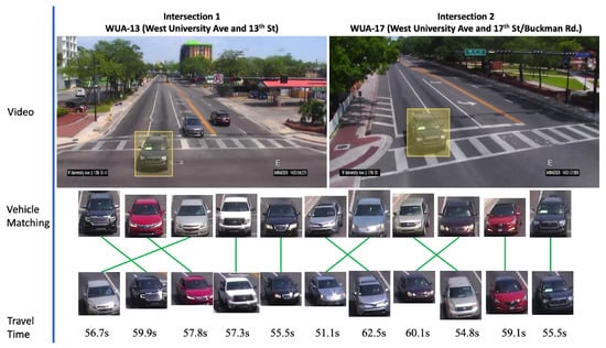 However, traffic patterns vary dynamically throughout the day as well as globally within the network, and there is a need for continuous monitoring and evaluation of signal timing parameters based on performance and fluctuation demands. To achieve this, travel times have to be calculated at regular intervals. In addition, it is important to understand the distribution of travel times rather than average travel times because the tail of the distribution gives traffic engineers rich information. Actual travel time often has a multimodal distribution, and the expected values are not always sufficient. The advent of video cameras at traffic intersections has opened the possibility of using them for instantaneous travel-time computation and is the focus of this paper. The novelty of our travel-time estimation is twofold. First, we used car signatures to estimate vehicle departure and arrival time from video across multiple cameras. In addition, we leveraged signal phasing and timing (SPaT) data in this system. To the best of our knowledge, this represents the first end-to-end framework that estimates vehicle travel time on corridor intersections using multiple videos and SPaT data (Figure 1).