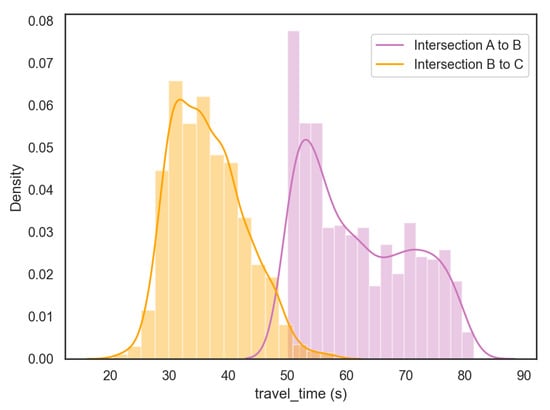 Travel-time distribution results of intersection A to intersection B and intersection B to intersection C.