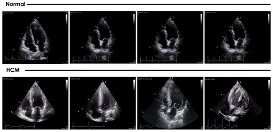 A total of 62 (mean age 50.7 ± 14.3 years) patients diagnosed with HCM who visited the cardiology outpatient department at a single center were prospectively recruited, and 101 age-matched healthy individuals (mean age 52.4 ± 15.5 years) attending the same center for routine health checks were recruited as controls. The institutional ethics committee approved the study at Kasturba Hospital Manipal (IEC NO.: 48/2020), and informed consent was obtained from the participants. HCM was diagnosed if the echocardiographic examinations showed a nondilated, hypertrophic left ventricle (LV) without any known cause; i.e., long-term hypertension or another cardiac/systemic disease, and the ratio of the thickness of IVS and posterior wall thickness (PW) was >1.3 with or without left ventricular outflow tract obstruction (LVOTO), or patients diagnosed with apical HCM. Among HCM patients, 42 (67.74%) presented with symptoms such as chest pain, dyspnea on exertion, and syncope, and 20 (32.25%) were incidentally diagnosed with HCM. Subjects with hypertension, renal failure requiring medical intervention, left ventricular ejection fraction < 55%, known ischemic heart disease, congenital heart disease, and valvular heart disease of more than mild severity were excluded from the study. All participants underwent heart US examination on a Vivid S60 system (GE Healthcare) with a 3Sc-RS phased array transducer probe and a frequency range of 1.3 to 4.5 MHz. Standard parasternal short-axis view at the mid-left ventricular (papillary muscle) level and apical 2- and 4-chamber views were acquired and archived digitally. In each participant, one static image at one time frame corresponding to the R wave on ECG from the cine 4-chamber view was selected for analysis using the CAD. In total, 62 and 101 images of HCM and normal subjects, respectively, were analyzed. Examples of typical images used are provided in Figure 2.