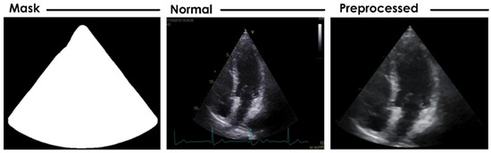 Unwanted information such as labels, signals, etc., was first removed from the apical 4-chamber heart US image. A mask was then generated to extract the region of interest to increase system efficacy, and a median filter of size 5 × 5 was applied to it to reduce the noise level. The filtered image was then resized using the bicubic interpolation technique for further processing [30]. Figure 4 shows the created mask and preprocessed image.