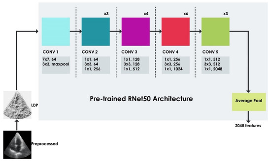 The bottleneck residual block for RNet50 consisted of three convolutional layers: the initial and final 1 × 1 layers reduced and restored the dimensions, respectively; while the middle 3 × 3 layer dealt with the reduced dimensions [29,38]. This bottleneck architecture greatly reduced the computational complexity and the number of parameters. The inputs to RNet50 were RGB images with dimensions of 224 × 224, and the output dimensions were reduced to 112 × 112, 56 × 56, 28 × 28, 14 × 14, 7 × 7, and 1 × 1 after passing in turn through the five categories of convolutional and average pool layers [29,39]. These RGB images were obtained by triplicating the gray level channel. In general, deep layers learn global features while shallow layers are utilized to capture features such as corners, edges, curves, etc. (i.e., local features). The knowledge of learned features from a general image dataset can be transferred to other domains, which helps save training effort and time [27,36,40,41]. The current study used the pretrained RNet50 with its weights unchanged to extract the local features from heart US images to train the final layers. Here, transfer learning was a nonlinear function that used the source task and domain knowledge to learn the target task in the target domain [23]. The complete structure of the feature extraction stage is illustrated in Figure 7. Note that the LDP (not the raw) image of the heart US image was input to the pretrained RNet50 to obtain a feature size of 2048. The RNet50 architecture had been pretrained in the ImageNet database [31] and modified to classify the images into two classes: normal and HCM. The weights were updated using the stochastic gradient descent with the momentum algorithm on a GTX 1070 GPU, with an initial learning rate of 0.0001 and a learn rate drop factor of 0.01. This was done for a mini-batch size of 32, and the sequence was shuffled every epoch and validated at every 10th epoch.