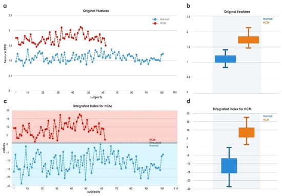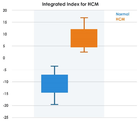 The highest-ranked feature, LDPRes870, was highly significant, and its distribution is shown in Figure 8a,b. It can be seen that both normal and HCM data were distributed toward the positive side. Hence, highly significant features of LDPRes870 were used in Equation (5) for IIHCM. It was noted from Figure 8c that HCM and normal data were distributed toward the positive and negative sides, respectively. From Equation (6), the threshold value was calculated as Th ≈ 0.5, a single distinct number that separated the HCM versus normal cases as shown in the box plots of indexed data in Figure 8d. An integrated index above a threshold of 0.5 separated HCM from healthy subjects with 100% accuracy in our test dataset.