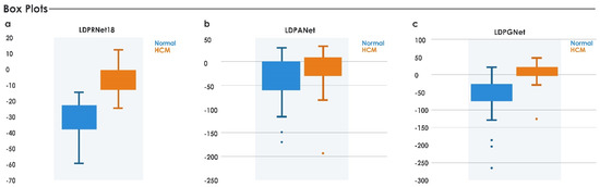 Using Equations (5) and (6), a single number was formulated for each feature that could distinguish HCM from normal subjects. IIHCM was also applied to other deep features (Table 4), but the results from RNet18, ANet, and GNet did not surpass those derived from the RNet50 network (Figure 10), and could not discriminate as well between healthy versus HCM subjects. The box plot for DNet is not shown due to its negative values.