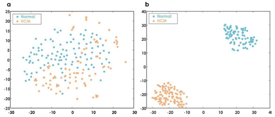 We synthetically generated minority class samples using an adaptive synthetic (ADASYN) sampling approach [65]. ADASYN uses the weighted distribution of minority data and reduces the bias that is introduced due to an imbalanced dataset. As a result, we obtained 198 samples (i.e., normal = 101 samples and HCM = 97 samples) after ADASYN. Further, the obtained LDP-RNet50 features of all the samples were analyzed using the t-distributed stochastic neighbor embedding (t-SNE) technique, which helped to visualize data by reducing its dimensions [66]. Figure 12 shows the data visualization of ranked LDP-RNet50 features using t-SNE.