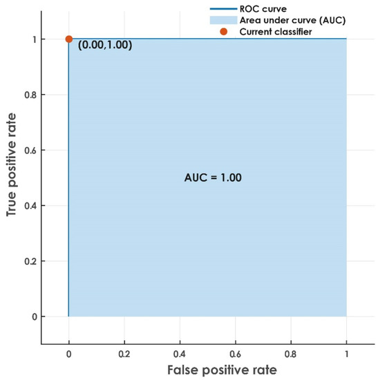 Further, we performed classification using the k-fold cross-validation technique. The SVM classifier obtained an accuracy of 100%, a sensitivity of 100%, and a specificity of 100% with 10-fold cross-validation (the obtained results were identical when k = 5 and 7). In addition, it was noted that the proposed system achieved an area under the curve (AUC) of 1.00 (Figure 13).