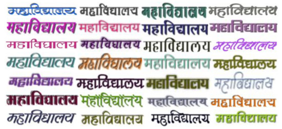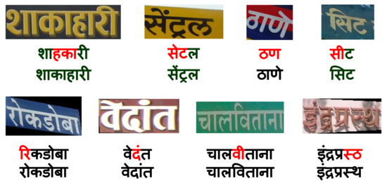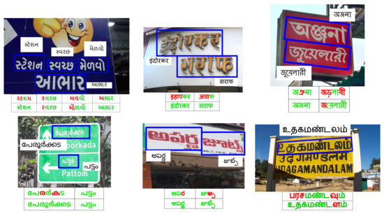 - Mathew, M.; Jain, M.; Jawahar, C. Benchmarking Scene Text Recognition in Devanagari, Telugu and Malayalam. In Proceedings of the 2017 14th IAPR International Conference on Document Analysis and Recognition (ICDAR), Kyoto, Japan, 9–15 November 2017; Volume 7, pp. 42–46. [Google Scholar]