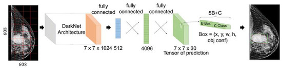 One of the most sophisticated DL networks is the convolutional neural network (CNN). CNN is a type of multilayer perceptron using the convolution operations. The works [17,18,19] show that CNN-based CAD systems for breast lesion detection and recognition achieve higher performance on the selected sets than conventional machine learning methods. YOLOv4 represents the CNN-based one—stage detector, which shows good accuracy in detecting lesions on a mammogram [20,21,22,23] with the accuracy in the range 80–95% in different databases (CBIS-DDSM, INbreast, etc.).