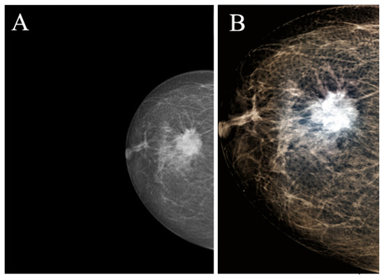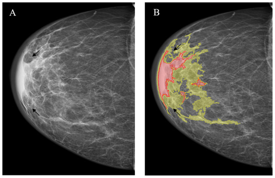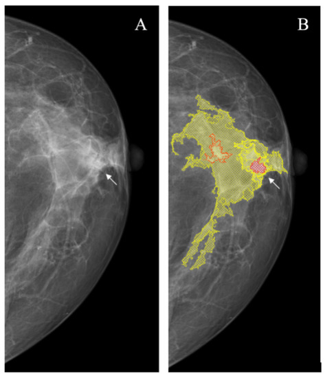 Star-like lesion (n = 16) represented the typical mammographic appearance of BC corresponding to the dense center with a long spicula. In most cases, these lesions corresponded to BIRADS 4–5 categories. The detection rate for the YOLOv4 and the NCA did not differ significantly; however, the rate of false-positive markings was significantly higher for NCA (9/16 vs. 0/16; p < 0.001) (Figure 4, Table 3).