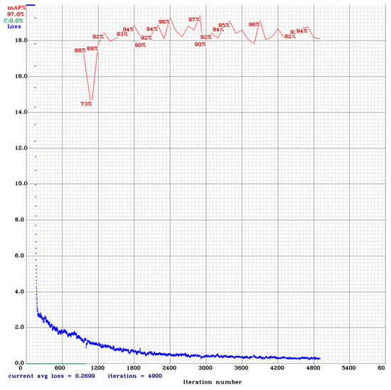 The results of the YOLOv4 training. The red line—mean Average Precision (mAP). The blue line–error graph (Loss).