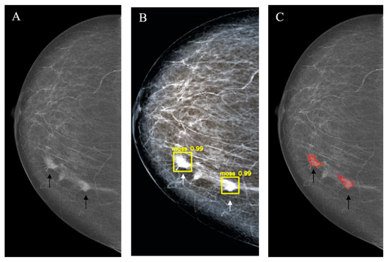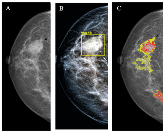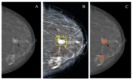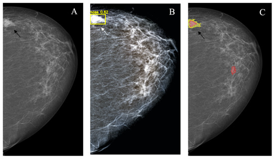 Partly visualized mass (arrow). (A): Source image; (B): YOLOv4 outcome; (C): NCA outcome.