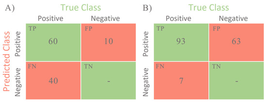 Confusion matrixes for (A): YOLOv4-based method and (B): NCA-based method. TP—the model detected a lesion where it actually exists; FP—the model detected a lesion where it actually does not exist; FN—the model did not detect the lesion, where it actually exists.