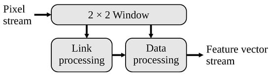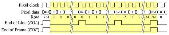 The input pixel stream is a continuous sequence of binary pixel data, following a standard row-wise raster scan, as illustrated in Figure 2. The absence of blanking between rows and frames requires two control signals, one to indicate the last pixel in each row (), and the other to indicate the last pixel in a frame ().