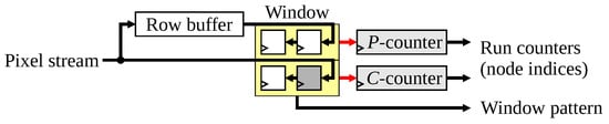 The third data structure is a row buffer, which makes processed labels on one row available for processing the following row, and is a consequence of the window required for propagating labels and determining connectivity. The length of the row buffer generally corresponds to the width of the image (although it can be shorter if preprocessing is used to simplify the image contents by removing noise, and run-length encoding the relevant information []). The width of the row buffer is usually the width of a label (for propagating labels from one row to the next), although it can be reduced to a single bit for deterministic labelling [,].