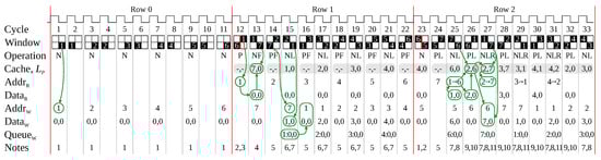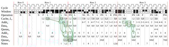Lacassagne and Zavidovique [] identified memory accesses and conditional statements to be the key issue slowing down CCL on RISC (reduced operation set computing) processors. In [] this was identified to require the fewest processing cycles per pixel when carried out on a general-purpose processor. Newer versions of this algorithm also consider vector processing []. Even though [] has not been directly realised as hardware architecture for CCL/CCA, this algorithm considers many hardware aspects, such as memory hierarchy and data path, which provided inspiration for FPGA implementations.