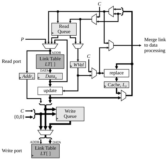 However, the critical path within the link processing module has a similar propagation delay. It runs from the output of the link table ( in Figure 8) through the update and replace blocks, into the cache, . While the update and replace blocks are primarily multiplexers, the critical path involves checking whether or not the link being added is already present (which is used to control the multiplexers). Adding a pipeline register within this path would delay the loading of by one clock cycle, potentially introducing additional memory conflicts and read-before-write hazards to those identified in Section 4.2.