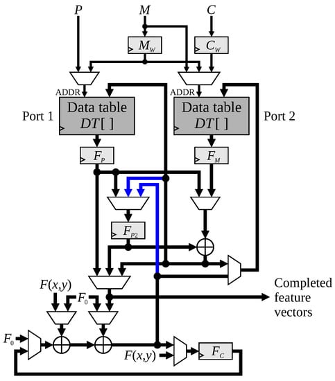 The first of these is the data table, which contains the feature vectors of the partially completed components. The width of the data table depends only on the feature vector being extracted (extracting more features requires a wider data table). For single-pass CCA algorithms the depth of the data table depends on the number of active labels, which for current algorithms, corresponds to half of the width of the image. Consequently, the size of the data table is generally independent of the particular algorithm. In terms of data processing, a minimum of two ⊕ operators are required, one for accumulating the feature vector of the current pixel, and one for managing component mergers.