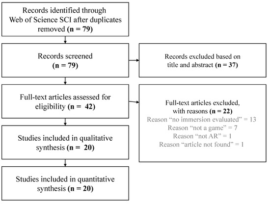 A total of 22 articles were excluded from the analysis when screening the text due to not presenting immersion data (13 records), not being a game (7 records), not presenting an AR experience (1 record) or for not being possible to obtain the full-text version of the record (1 record). After this process, a total of 20 studies remained for the qualitative and quantitative analyses.
