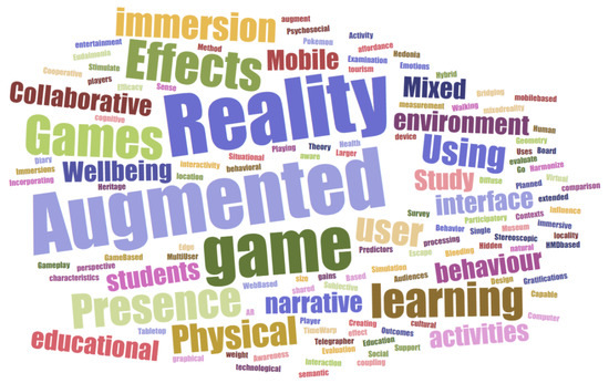 Regarding the technical concepts and approaches used, we observed a preference for “augmented reality” while “Games” and “game” were predictably frequent words as well. There was a tendency for the frequent use of “presence” and “immersion”. An interesting concept that appeared quite frequently was “learning”.