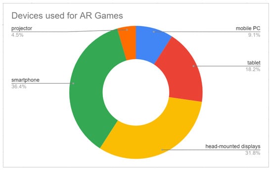 As illustrated in Figure 3, most of the studies used smartphones (36%) or head-mounted displays (32%). The other devices used were tablets (18%), mobile computers (9%), and a video projector (5%). Considering the platform of usage, smartphones and tablets may be grouped to represent 54% of the devices used. Since some studies implemented more than one solution, the percentages presented are related to a total of 22 implementations (all coming from the total of 20 studies analysed).