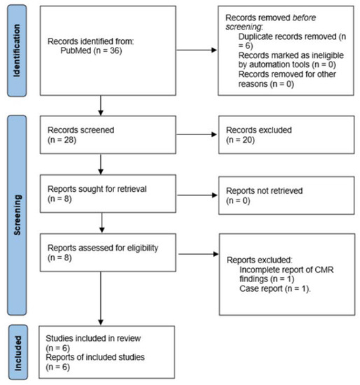 We performed the systematic research on Embase/PubMed using the following strings: [“immune checkpoint inhibitors” AND “myocarditis” AND “magnetic resonance imaging”] and [“immune checkpoint inhibitors” AND cardiotoxicities AND “magnetic resonance imaging”]. The search is updated to 31 January 2021, and retrieved 36 results that were subsequently assessed for inclusion using the PRISMA methodology [11] (Figure 1). As per prespecified criteria, case reports were excluded from the analysis. After screening for eligibility, 6 studies were finally selected [12,13,14,15,16,17]. Two of these [15,16] enrolled patients within a same multicenter registry, albeit providing partly different information (e.g., T1 and T2 mapping in one); for this reason, they were both included in the analysis.