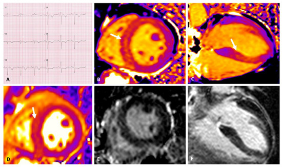 ECG with diffuse T- wave inversion (A). Native T1 mapping, higher signal detected within the interventricular septum in the mid-short axis (arrow in (B)) and in 4-chamber view (arrow in (C)); in the same area; T2 mapping shows higher signal intensity indicating edema (arrow in (D)). Absence of replacement fibrosis as assessed by LGE (E,F). Adapted with permission from [18].