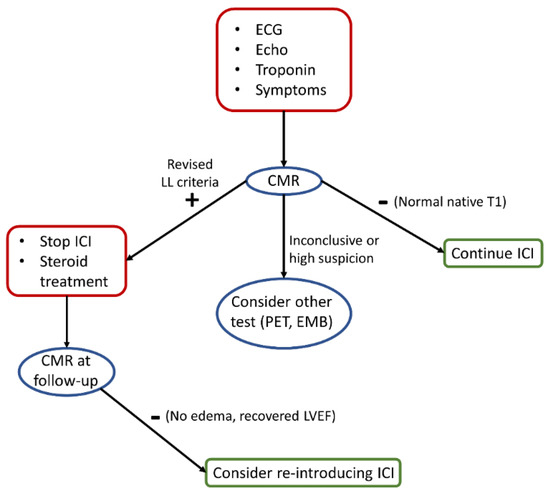 In this context, CMR examination plays a pivotal role to explore a suspected ICI-M under a clinical suspicion (Figure 3). Symptoms, increased troponin level and newly detected echocardiographic (ECG) abnormalities might suggest the need to perform CMR; additionally, electrocardiographic changes have been described after the baseline in patients with ICI-M, including prolonged QRS and QT interval duration, sinus tachycardia, decreased QRS voltages and repolarization abnormalities [49]. Hence, it might be reasonable to plan an imaging test after detecting new ECG abnormalities as compared to the baseline. CMR offers several tools for the evaluation of non-ischemic myocardial inflammation, whose diagnostic criteria have been recently updated [8]; specifically, the revised Lake Louise (LL) criteria now include the more recent T1 and T2 mapping techniques—this could have relevant implications for ICI-M. As shown by the aforementioned studies, myocardial changes can be often mild and potentially undetectable without using mapping tools. Accordingly, the agreement with EMB was relatively low in the study by Zhang et al., in which 50–60% of the patients with biopsy-proven myocarditis had negative T2-STIR and LGE imaging [15]; however, a further analysis from the same cohort and including only patients with an available tissue mapping evaluation demonstrated that at least one of the main modified LL criteria was present in all of the patients, and more than 80% of patients with biopsy-proven myocarditis had abnormal native T1 [16]. A negative scan, especially in the presence of normal native T1, should prompt reassurance, especially when considering the very low-risk of this subset of patients [16]. On the other hand, where LL criteria should not be met, albeit there remains clinical suspicion with inconclusive CMR examination, further tests such as EMB and positron emission tomography could be considered [50,51]. In the presence of a CMR-confirmed ICI-M diagnosis, the drug should be halted and treatment with steroids commenced. A CMR at follow-up can be considered to clarify the resolution of the disease, signified by regression of myocardial edema [52], or conversely, the evolution towards remodeling [53]. In patients undergoing cancer-related treatment, Haslbauer et al. observed a parallel increase in native T1 and T2 values when CMR scans were performed early after treatment initiation [54], indicating underlying myocardial edema; on the other hand, cases that underwent a late CMR examination (more than 12 months post-treatment) were more likely to have increased native T1 and lower T2 values, indicating fibrosis and cardiac remodeling. Re-challenge with ICI is currently a debated topic, and it has been hypothesized that reintroduction in low-grade patients might be a feasible option, albeit better definition of the grading is needed [55]. Potentially, CMR imaging biomarkers, especially the prognostic relevant native T1, could serve as criteria for considering a patient eligible for re-challenge with ICI.