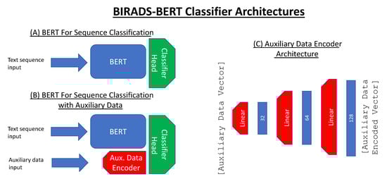 For section segmentation with auxiliary data, a sentence from the text report was identified by BI-RADS BERT by taking the BERT contextual embedding and concatenating it with the auxiliary data encoding, which was then fed into a final classifier. The auxiliary data that was used in this task was the classification of the previous sentence in the report, the number of the given sentence that it is classifying, and the total number of sentences in the report. These global textual features were intended to capture an understanding of the flow of section organization in the BI-RADS lexicon [].