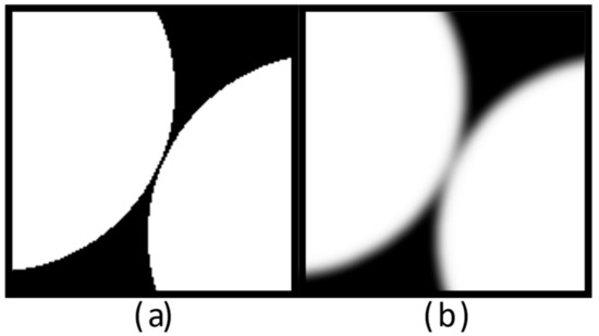 Representation of two non-contacting particles (a) and the effect of simulated partial volume blur (b), resulting in an increase in greyscale tone of the pixels in the gap between particles.