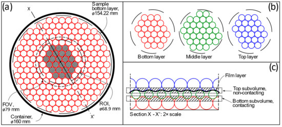 Pellet sample schematic: (a) plane view of bottom layer with pellets used in the analysis indicated by hatched region; (b) plane view of bottom, middle and top layers of pellets within the central ROI used in the analysis; (c) X-X’ vertical cross section through central ROI showing the top and bottom subvolumes, the film layer separating the middle and top lattices, and pellets used in the analysis indicated by hatched regions.
