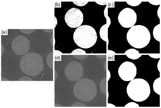 Section of horizontal XCT slice for scan B2 depicting two PE film-separated pellets: (a) after median and anisotropic diffusion filtering; (b) binarised using conventional global thresholding; (c) after morphological corrections; (d) after non-local means filtering; (e) binarised by applying conventional global thresholding to the non-local means filtered image.