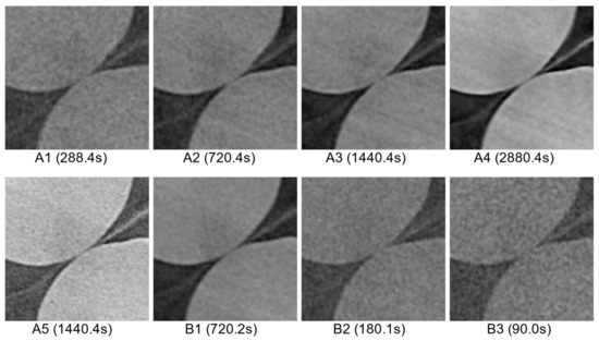 Section of horizontal XCT slices depicting two non-contacting glass pellets separated by a layer of PE film (seen as a diagonal streak) for different acquisition set-ups (Table 1). Total X-ray exposure time for each scan is shown in parenthesis.