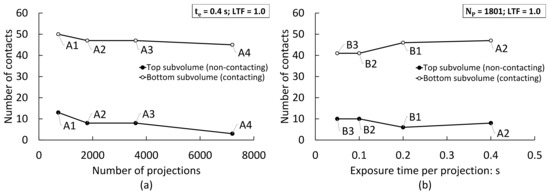 Number of contacts found in XCT data with (top subvolume) and without (bottom subvolume) a prescribed interparticle separation: (a) with different number of projections and using a constant exposure time per projection (te = 0.4 s); (b) with different exposure time per projection and using a constant number of projections (NP = 1801) per 180° rotation. Data labels refer to scan identifiers; see Table 1.
