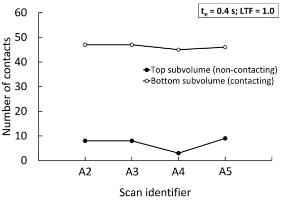 Figure 6 compares the number of detected contacts resulting from acquiring XCT data using a 0–180° angular range (scans A2, A3), a 0–360° angular range (scan A4), and the half-acquisition technique by which the sample is placed at an offset from the COR of the tomography stage and scanned through 360° to increase the field of view (A5; see Section 2.2). As with the data in Figure 5a, scans were acquired using an X-ray exposure time of 0.4 s. Likewise, the conventional global thresholding method without local refinements was employed to binarise the images and contacts were extracted by applying an LTF of 1.0 to presumptive contact regions found in the labelled volume (Table 2). By comparing the results for scan A3 and A4, it may be noted that the doubling of the angular range, and of the number of projections, resulted in a lower number of spurious interparticle contacts detected in the non-contacting subvolume. In contrast, the 0–360° rotation half-acquisition technique delivers a marginally higher contact over-detection number when compared with scan A2 (8 vs. 9 contacts), which was acquired with the same number of projections and, thus, the same total exposure time per 180° rotation. The number of contacts in the bottom subvolume of touching pellets did not vary significantly with the different acquisition methods, generally exhibiting an over-detection of up to two counts, or less about 4%.