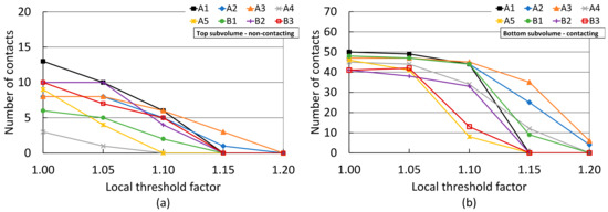 Number of detected contacts between pellet lattices after local refinement using different local threshold factors: (a) top subvolume with a prescribed interparticle separation; (b) bottom subvolume of full-contacting particles. See Table 1 for scan acquisition details. Data binarised using U-Nets.