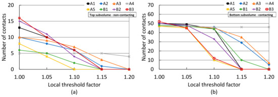 Figure 7 presents the effect of applying the local refinement technique proposed by Wiebicke et al. [17], summarised in Section 2.4. The XCT data were segmented using global threshold binarisation and LTFs ranging from 1.0 to 1.2 were applied to the apparent contacts extracted from the labelled volume, as described in Section 2.3. In Figure 7a, it may be observed that a local threshold value just 1.05 times larger than the global threshold used to binarise the data was sufficient to produce a notable decrease in the number of spurious contacts found for the top subvolume of film-separated pellets, for most scans. For these scans, this represented a false positive count reduction of between 17 and 67%. However, scans A3 and B2 required larger LTFs values to achieve spurious count decrements. The use of higher local thresholds resulted in similarly substantial reductions in false contacts. Significantly, Figure 7b shows that even the lowest LTF value of 1.05 resulted in the under-detection of true contacts for all scans but A2, A3, and B3. This was particularly severe for the lower exposure scan B2, and for the half-acquisition scan A5. For these scans, an LTF of 1.05 resulted in up to 11% of the true contacts detected with LTF = 1.0 being lost. Moreover, spurious contact elimination in the non-contacting top subvolume could only be achieved for most scans after the use of LTFs of 1.15, which resulted in the drastic under-detection of true contacts in the bottom subvolume, to the point of completely removing all true contacts in half of the XCT datasets. Even the high-exposure scan A3, which was less susceptible to contact suppression by local refinements, exhibited a reduction of true contacts of nearly 26% from the count at LTF = 1.0 when an LFT of 1.15 was used for local refinement.