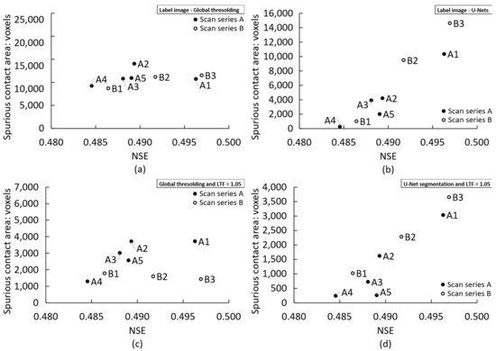 Furthermore, a comparison between the total spurious interparticle contact area measured for each scan (i.e., before the application of LTF = 1.0 at presumptive contacts, or any other local refinement), presented in Figure 10b,d, reveals that the use of scan parameters that lead to lower acquisition noise (i.e., higher NSE and CNR) in most cases resulted in smaller spurious contact areas for the U-Net-segmented data. This may be associated with the higher segmentation accuracy attributed to CNN-based methods compared with conventional global thresholding approaches, as demonstrated in previous works [23,24]. Nevertheless, it must be again emphasised that such accuracy improvements hinge on the preparation of suitable training label images where partial volume blur is omitted from the grain/solid label. Such images are usually obtained via hand-annotation, which may be an onerous task and limited by the perception of the human operator. Additionally, the implementation of a U-Net method requires significant computing resources.