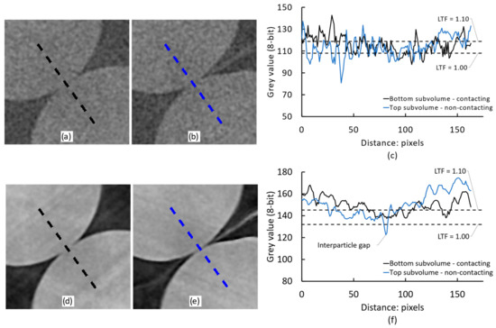 Grey value sampling profiles on horizontal XY slices: (a) true interparticle contact in bottom subvolume of scan B3; (b) film-separated particles in top subvolume of scan B3; (c) grey value profiles sampled from black and blue dotted lines in (a) and (b), respectively; (d) true interparticle contact in bottom subvolume of scan A4; (e) film-separated particles in top subvolume of scan A4; (f) grey value profiles sampled from black and blue dotted lines in (d) and (e), respectively.