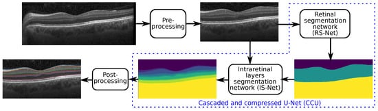 The proposed method starts with preprocessing an input volume scan to remove undesired components from each B-scan (Figure 1). It then performs intraretinal segmentation using a cascaded network, where each stage is a compressed U-Net-like network. Finally, during postprocessing, we derive continuous surfaces and introduce anatomical constraints. The term cascaded network refers to the combination of two networks in a sequential manner and each network is a compressed U-Net-like architecture, which is a lighter version of U-Net, to minimize the computational resources. In the following, we explain each component of the pipeline in detail.