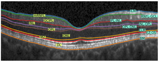 Intraretinal layer segmentation is not a trivial task as layer changes can be small, while texture gradients can be weak and influenced by noise [16]. While many OCT manufacturers provide device-integrated segmentation of some intraretinal layers, results are often noisy and regularly require manual correction, which in itself is challenging for clinical use and difficult to handle in research settings when multiple graders review macular OCT images [16,17]. A reliable and robust algorithm for intraretinal layer segmentation that requires no or minimal manual correction is an unmet need to foster reliable and reproducible research as well as clinical application [18].