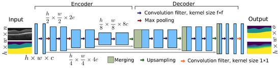Figure 3 shows the architecture of the proposed compressed U-Net. Similar to U-Net, the proposed method has contracting and expansive paths. The contracting or encoder part has four stages and, at each consecutive stage, the channel depth is doubled and the input size is halved (via max pooling). Additionally, dropout layers are added after the third and the fourth stages to avoid overfitting. In the decoder part, the inverse of the encoder part occurs, except that it has two additional blocks: merging and output convolution layers with a kernel size of 1, as shown in Figure 3. The terms h and w represent the size of the preprocessed image. The number of the input channels is represented by n and it is clear from Figure 1 that for RS-Net and for IS-Net. Optimal architecture parameter values (h, w, f, c) are explained in Section 2.3.