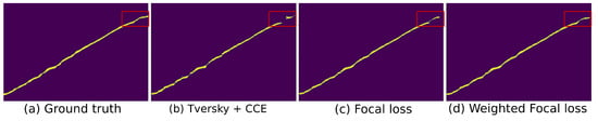 where and represent the number of pixels in the foreground and in the image, respectively. For our training, we have used weighted focal loss , where each class is weighted based on the corresponding foreground–background pixel ratio. The improvement in the outcome is visualized in Figure 4.