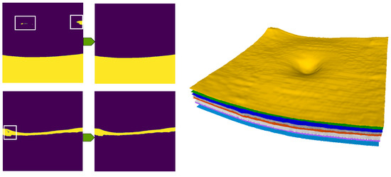 The first column shows small holes, which appear during the classification in both networks. The second column consists of images without holes. The last column shows 3D reconstructed surfaces of different layers.