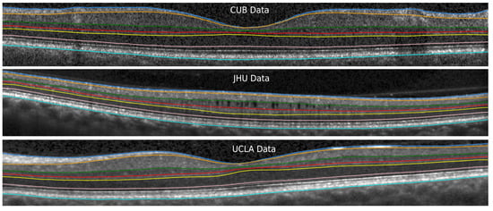 Table 7 shows layer-based MAE computed between CCU-INSEG’s outcome and the manually corrected gold standard segmentation for the CUB and UCLA data sets and the manually corrected segmentation by the publishers for the JHU data set. As can be seen, the proposed method produces a high-fidelity segmentation with regard to the gold standard segmentation. Errors for different layers are in sub-pixels, except for the INL-OPL boundary in the JHU data.